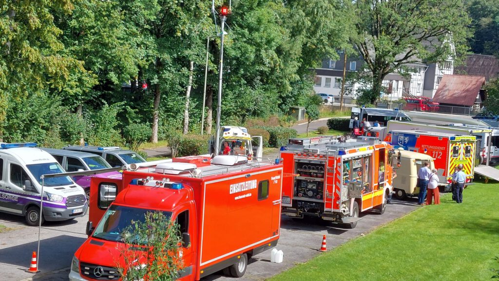 lm Verlauf des Frühjahres und des Frühsommers, haben wir als Förderverein, den Faden wieder aufgenommen und insgesamt 3 Planungsbesprechungen gehabt. Dabei ergab sich eine gute Zusammenarbeit mit den anderen Hilfsorganisationen, insbesondere mit den Damen vom THW OV Waldbröl und den Kameradinnen und Kameraden der Johanniter-Rettungshundestaffel aus Oberwiehl hatten wir organisatorische Helferinnen. Aus dem Kreis der Besprechung kam dann auch die Idee mit der begleitenden Fahrzeugausstellung. Verwegen wie ich sein kann, habe ich versucht, neben den Fahrzeugen von Polizei, Feuerwehr, Rettungsdienst, DRK, THW, DLRG, Johanniter Unfall Hilfe und Notfallseelsorge auch den Rettungshubschrauber Christoph 25 für eine Stippvisite zu gewinnen. Das hat leider nicht geklappt. An dieser Stelle ein großes Dankeschön an alle „Mitmacher“.