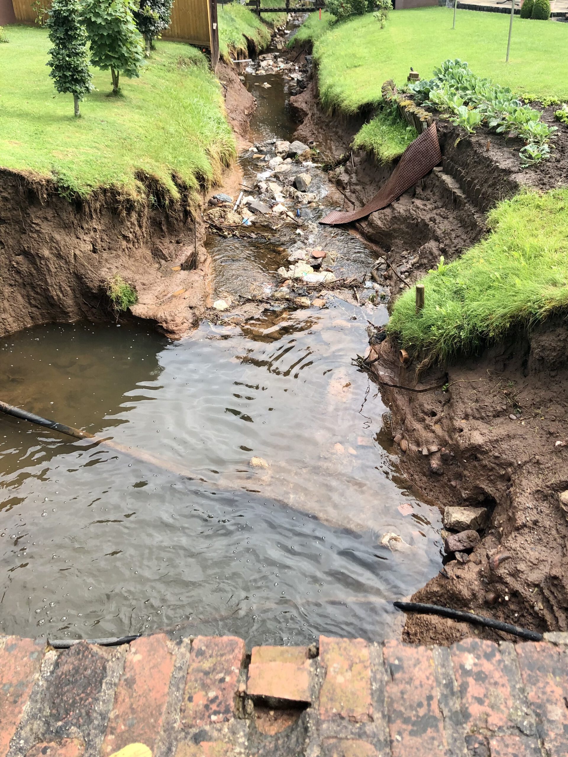 Der Bach hat sein Bett zu beiden Seiten aufgerissen. Anliegende Häuser waren überflutet.